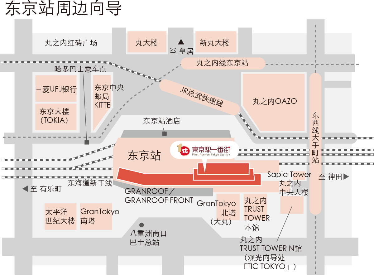 東京站一番街位於JR東京站設施內(檢票口外)。從新幹線或在來線的八重洲側各檢票口出來即可抵達。