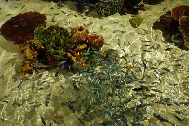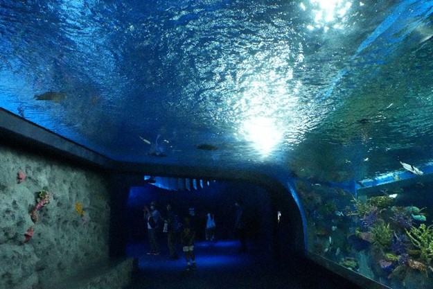 放眼望去是遼闊的魚群與珊瑚礁,仰頭就會看見魚群就在天花板上游泳,如同穿越水中隧道一樣壯觀。