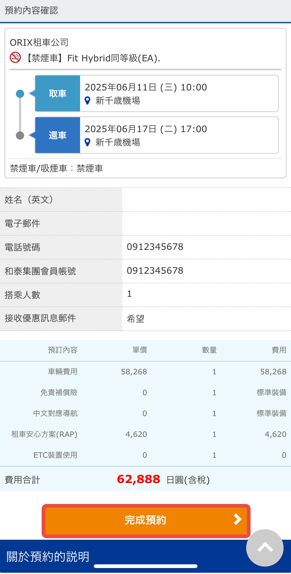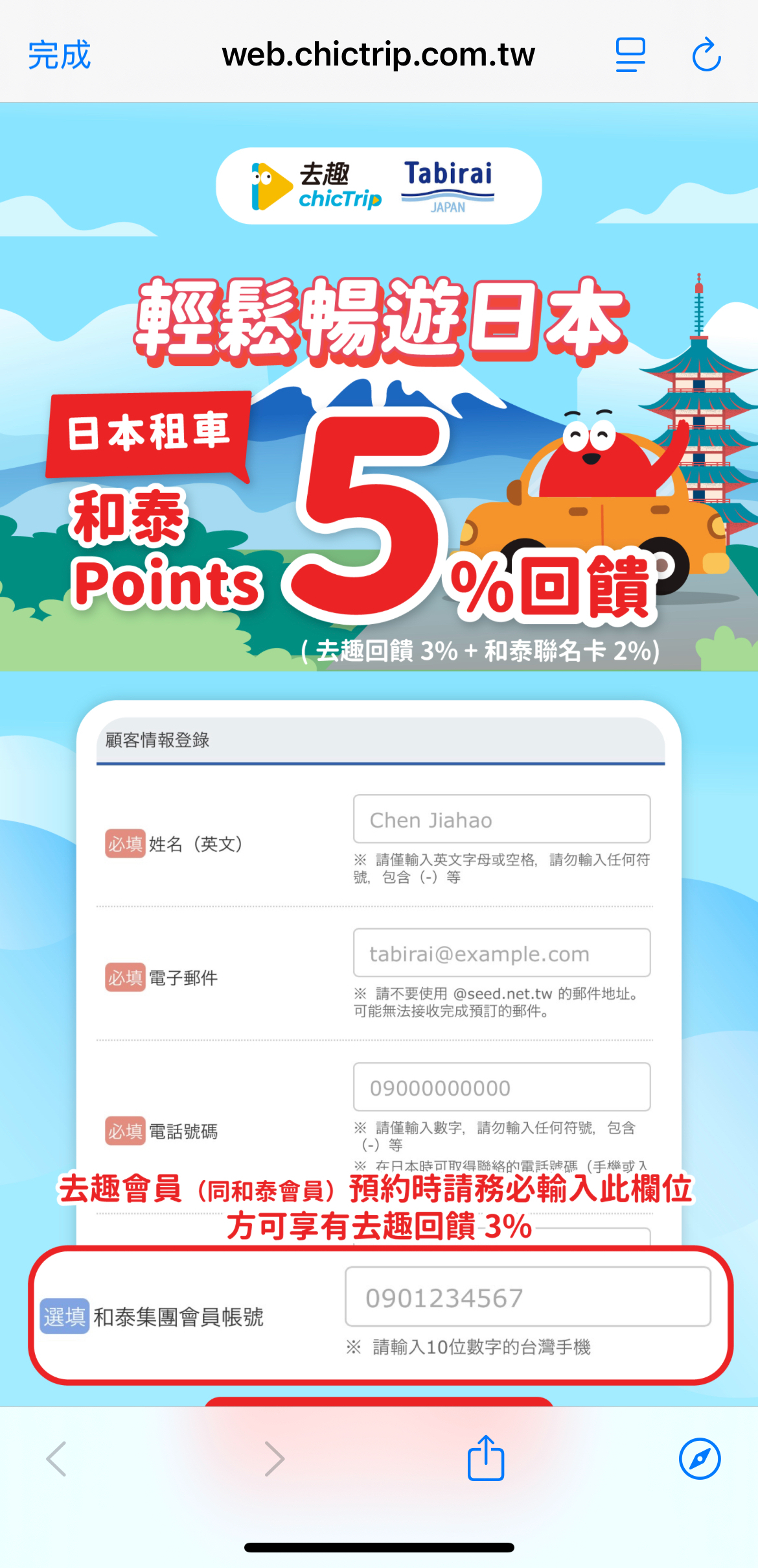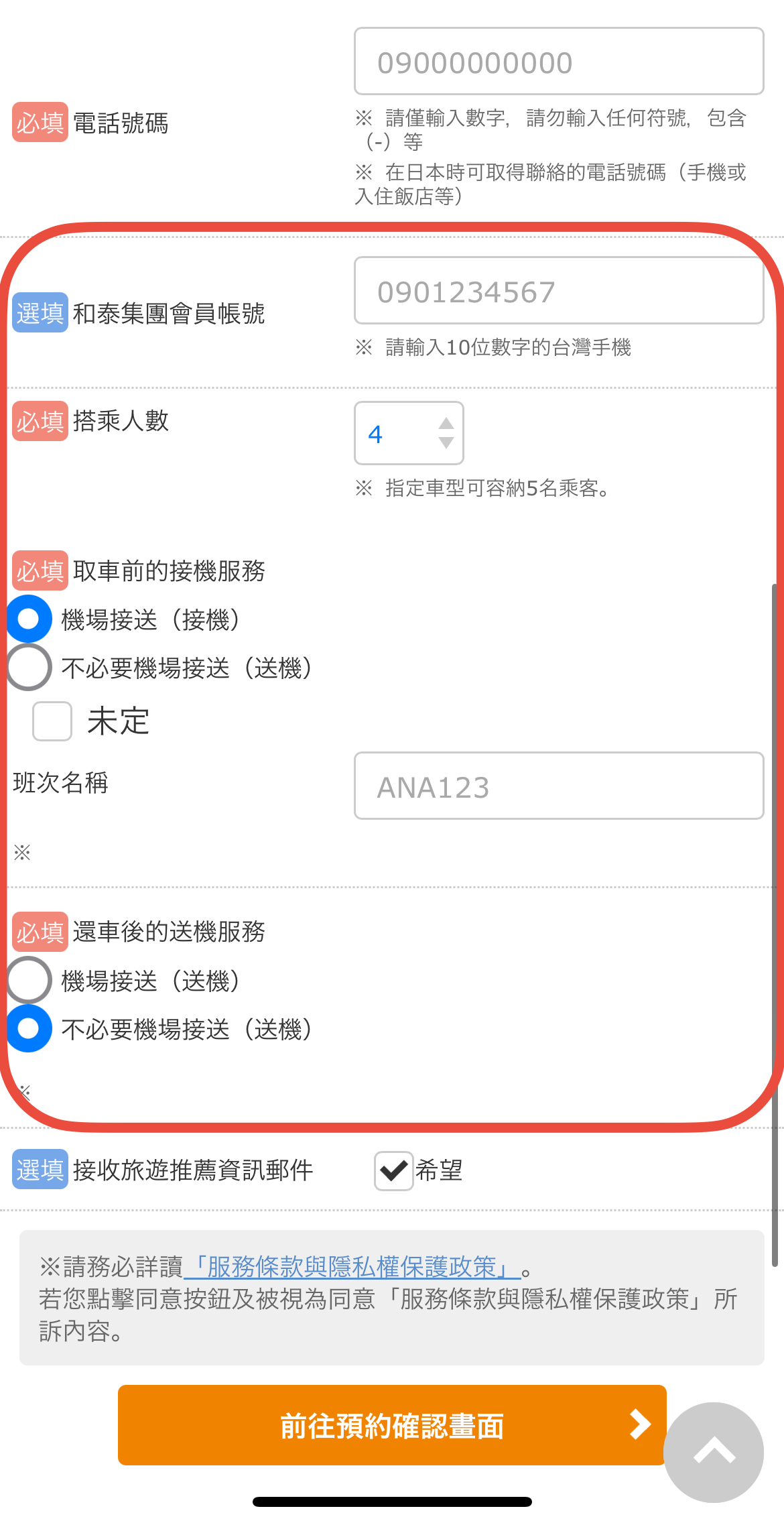 輸入預約聯絡人資料,記得輸入「去趣帳號 (和泰集團會員帳號)」才能拿到和泰 Point 回饋~~此外,部分門市有提供機場接送服務,也能在這裡選擇,並且輸入航班號。以上確認完畢後,就能下滑到頁面末尾進入付款。