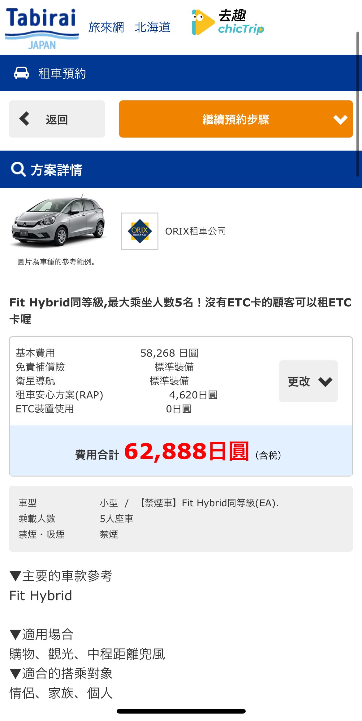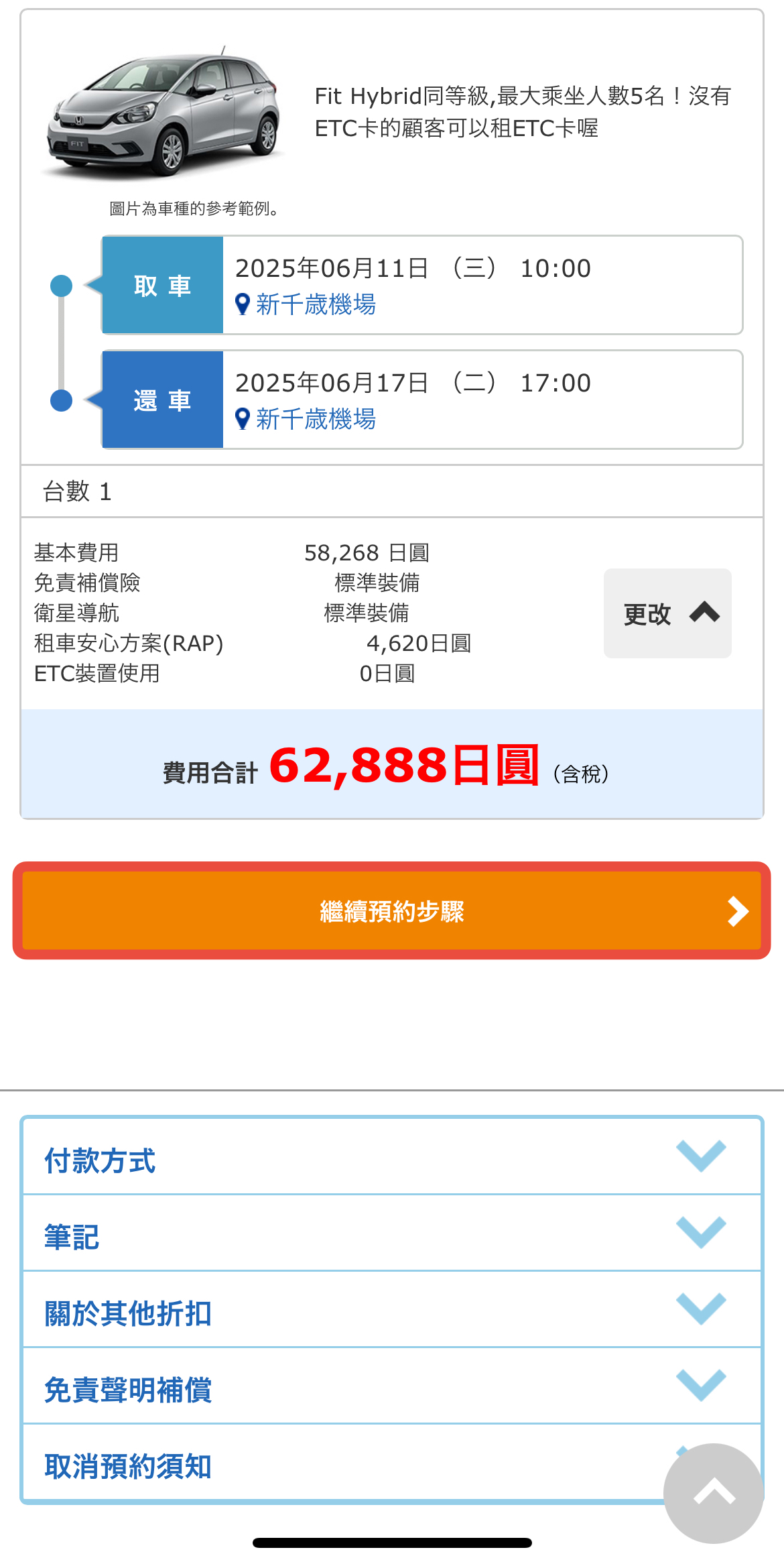 檢視方案詳情和金額。確認預約租車條件,加購額外設備。點擊「繼續預約步驟」進行下一步。