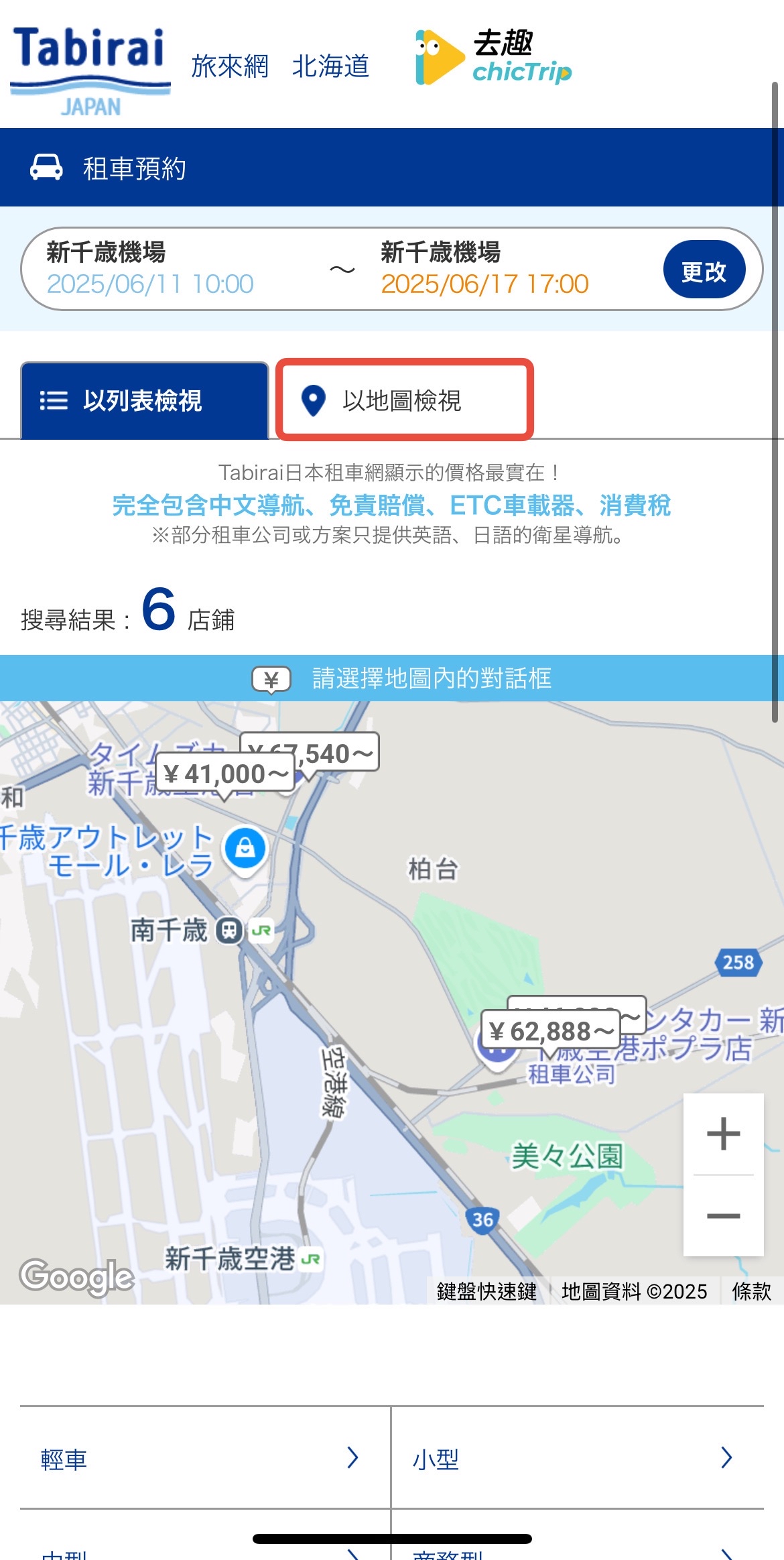 頁面下滑比較車輛和車行,可以在說明框中了解車型說明和租車公司的規則,選擇合適車款。如果不知道門市在哪,只要點選「以地圖檢視」,就能找到離你最近、最方便的的門市~